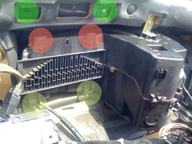 Tutaj widok od środka po wyjęciu całej obudowy wentylatora. Na żółto zaznaczyłem miejsce po szpilce, od drugiej strony przychodzi nakrętka, tj. od strony podszybia. Dziura która widać to wlot powietrza do kabiny, a po lewej widać parownik od klimatyzacji. Po prawej drzwi pasażera.